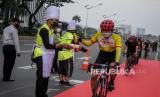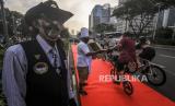 Sejumlah anggota Komunitas Bike To Work Indonesia membagikan makanan kepada pesepeda di kawasan Sudirman, Jakarta, Jumat (10/7). Aksi simpatik bertajuk Yang Bersepeda Yang Istimewa itu untuk mengedukasi pengguna jalan untuk tertib berlalu lintas serta membagikan makanan dan minuman gratis untuk pesepeda yang melintasi kawasan tersebut. Republika/Putra M. Akbar (FOTO : Republika/Putra M. Akbar)