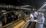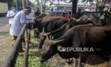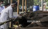 Petugas memeriksa kesehatan hewan kurban di Rumah Potong Hewan (RPH) Cakung, Jakarta, Jumat (10/7). Pemeriksaan itu dilakukan untuk menjamin kesehatan hewan kurban menjelang Hari Raya Idul Adha 1441 Hijriah. Republika/Putra M. Akbar (FOTO : Republika/Putra M. Akbar)