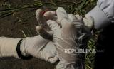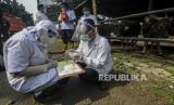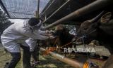 Untuk memantau kesehatan hewan yang diperjuabelikan, petugas mengambil sampel darah hewan kurban di Rumah Potong Hewan (RPH) Cakung, Jakarta, Jumat (10/7).