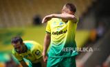 Pemain Norwich City, Marco Stiepermann tampak kecewa saat gol pertama WHU bersarang di gawangnya. (FOTO : EPA-EFE/Alex Pantling/NMC/Pool)
