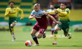 Emiliano Buendia (kanan) menempel ketat Jarrod Bowen (kiri) pada laga Norwwich vs WHU, Sabtu (11/7). (FOTO : EPA-EFE/Alex Pantling/NMC/Pool)