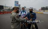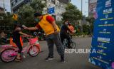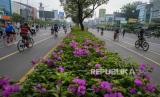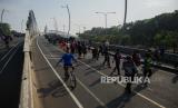 Sejumlah warga mengendarai sepeda saat gelaran Car Free Day (CFD) Bekasi di area Jalan Ahmad Yani, Kota Bekasi, Jawa Barat, Ahad (12/7). Namun aturan jarak fisik masih sulit diterapkan pada gelaran tersebut akibat pergerakan warga yang masif. (FOTO : Republika/Thoudy Badai)