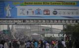 Sejumlah warga memadati area Car Free Day (CFD) Bekasi di Jalan Jendral Ahmad Yani, Kota Bekasi, Jawa Barat, Ahad (12/7). CFD tersebut digelar dengan menerapkan protokol kesehatan. Namun aturan jarak fisik masih sulit diterapkan pada gelaran tersebut akibat pergerakan warga yang masif. (FOTO : Republika/Thoudy Badai)