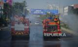 Petugas Pemadam Kebakaran menyemprotkan cairan disinfektan usai gelaran Car Free Day (CFD) Bekasi di Jalan Ahmad Yani, Kota Bekasi, Jawa Barat, Ahad (12/7). Namun aturan jarak fisik masih sulit diterapkan pada gelaran tersebut akibat pergerakan warga yang masif. (FOTO : Republika/Thoudy Badai)