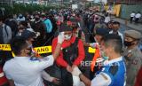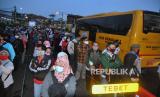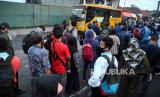 REPUBLIKA.CO.ID, BOGOR -- Sejumlah calon penumpang antre untuk naik bus bantuan gratis di jalan Mayor Oking, Kota Bogor, Jawa Barat, Senin (13/7).