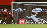 Pemain Bournemouth Dominic Solanke (kiri) menendang bola melewati kiper Leicester Kasper Schmeichel untuk mencetak gol keempat timnya pada pertandingan sepak bola Liga Primer Inggris antara Bournemouth dan Leicester City di Vitality Stadium di Bournemouth, Inggris, Senin (13/7) dini hari WIB. (FOTO : AP / Glynn Kirk)