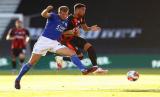 Pemain Leicester Ryan Bennett (kiri) dan pemain Bournemouth Arnaut Groeneveld berebut bola pada pertandingan sepak bola Liga Primer Inggris antara Bournemouth dan Leicester City di Vitality Stadium di Bournemouth, Inggris, Senin (13/7) dini hari WIB. (FOTO : AP/ Michael Steele)