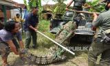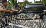 REPUBLIKA.CO.ID, SERANG -- Petugas Balai Konservasi Sumber Daya Alam (BKSDA) Banten bersama warga menggotong buaya muara (Crocodylus porosus) yang baru tertangkap di aliran Sungai Cidanau Kampung Ciparay, Cinangka, Serang, Banten, Senin (13/7/2020).
