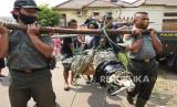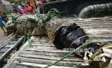 Petugas Balai Konservasi Sumber Daya Alam (BKSDA) Banten bersama warga menggotong buaya muara (Crocodylus porosus) yang baru tertangkap di aliran Sungai Cidanau Kampung Ciparay, Cinangka, Serang, Banten, Senin (13/7/2020). Buaya muara dengan panjang sekitar 3 meter dan berat 250 kilogram itu ditangkap warga bersama petugas BKSDA Banten untuk selanjutnya akan direhabilitasi di pusat penangkaran dan konservasi buaya di Pandeglang. (FOTO : ANTARA/ASEP FATHULRAHMAN)