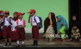 REPUBLIKA.CO.ID, KONAWE -- Sejumlah murid berlari memasuki ruang kelas di SD Negeri 1 Praja Taman Sari di Desa Wonuamonapa, Konawe, Sulawesi Tenggara, Senin (13/7/2020).