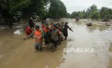 Petugas gabungan mengevakuasi korban banjir bandang di Desa Radda, Kabupaten Luwu Utara, Sulawesi Selatan, Selasa (14/7/2020). Petugas BPBD Sulawesi Selatan masih menginventarisasi kerugian akibat banjir bandang pada Senin, 13 Juli 2020 yang mengakibatkan puluhan rumah terbawa arus, dua orang meninggal dan tujuh orang hilang. (FOTO : ANTARA/INDRA)