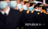 Prajurit mengenakan masker sebelum parade Hari Bastille di jalan Champs Elysees, Paris, Selasa (14/7).  (FOTO : AP / Christophe Ena, Pool)