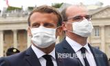 Presiden Prancis Emmanuel Macron (kiri) dan Perdana Menteri Prancis Jean Castex, mengenakan masker saat menghadiri parade militer Hari Bastille di jalan Champs Elysees, Paris, Selasa (14/7).  (FOTO : Ludovic Marin, Pool via AP)