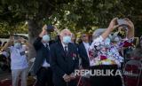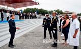 Presiden Prancis Emmanuel Macron menyambut tenaga kesehatan usai parade militer Hari Bastille di jalan Champs Elysees, Paris, Selasa (14/7).  (FOTO :  Ludovic Marin, Pool via AP)