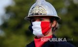 Seorang petugas pemadam kebakaran mengenakan masker dengan warna-warna bendera Prancis, sebelum parade Hari Bastille di Paris, Selasa (14/7). (FOTO : AP / Christophe Ena,)