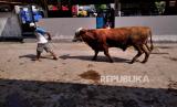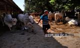 Peternak membawa sapi untuk ditawarkan ke pembeli di Pasar Ternak Ambarketawang, Bantul, Yogyakarta, Rabu (15/7). Menurut beberapa peternak harga sapi siap potong untuk Qurban turun hingga Rp 2,5 juta dibandingkan tahun lalu. Namun, untuk stock sapi siap qurban di Yogyakarta masih mencukupi. (FOTO : Wihdan Hidayat / Republika)