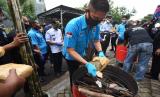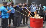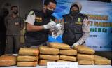 REPUBLIKA.CO.ID, CILEGON -- Dua Personel Dokkes Polda Banten menguji sampel ganja sebelum dimusnahkan di Cilegon, Banten, Rabu (15/7). Personel BNN berhasil mengamankan 15 kg ganja yang akan diselundupkan ke Jakarta menggunakan bus Damri serta menangkap tiga orang bandar yang memesan ganja tersebut.