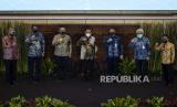 Menteri Perhubungan Budi Karya Sumadi (tengah) berfoto bersama (dari kiri) Direktur Utama PT MRT Jakarta William Sabandar, Direktur Utama PT Transportasi Jakarta Sardjono Jhony Tjitrokusumo, Wakil Menteri BUMN II Kartika Wirjoatmodjo, Gubernur DKI Jakarta Anies Baswedan, Direktur Utama PT Jakarta Propertindo Dwi Wahyu Daryoto dan Direktur Utama PT Moda Integrasi Transportasi Jabodetabek Tuhiyat seusai melakukan Penandatanganan Perjanjian Pemegang Saham Sistem Integrasi Pembayaran Antar Moda Transportasi di kantor Kementerian Perhubungan, Jakarta, Rabu (15/7/2020). Pemerintah mengintegrasikan pembayaran pelbagai moda transportasi massal di DKI Jakarta melalui sistem Electronic Fare Collection (EFC) yang akan dikelola oleh PT Jaklingko Indonesia. (FOTO : Antara/Dhemas Reviyanto)