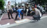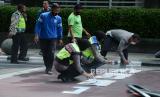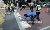Petugas dari Direktorat Lalu Lintas Polda Jawa Barat membuat ruang henti khusus (RHK) sebagai bentuk penerapan physical distancing bagi pengguna roda dua di Perempatan Jalan Merdeka-Jalan Aceh, Kota Bandung, Kamis (16/7). RHK nantinya akan tersedia di 159 titik traffic light yang tersedia di 22 kabupaten dan kota wilayah Polda Jawa Barat. RHK merupakan upaya preventif dalam meminimalisir adanya kerumunan kendaraan roda dua di ruang henti khusus pada traffic untuk mencegah penularan Covid-19. (FOTO : Edi Yusuf/Republika)