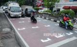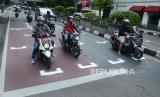 Sepeda motor berhenti di ruang henti khusus (RHK) sebagai upaya penerapan physical distancing bagi pengguna roda dua di Perempatan Jalan Merdeka-Jalan Aceh, Kota Bandung, Kamis (16/7). RHK nantinya akan tersedia di 159 titik traffic light yang tersedia di 22 kabupaten dan kota wilayah Polda Jawa Barat. RHK merupakan upaya preventif dalam meminimalisir adanya kerumunan kendaraan roda dua di ruang henti khusus pada traffic untuk mencegah penularan Covid-19. (FOTO : Edi Yusuf/Republika)