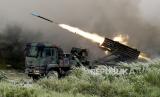 Sistem Peluncuran Roket Berganda (MLRS) Thunderbolt-2000 menembakkan roket selama latihan militer Han Kuang (Chinese Glory) ke-36 di Taichung, Taiwan, Taiwan, Kamis (16/7). Latihan menembak langsung mensimulasikan respons terhadap serangan musuh terhadap objek vital di Taiwan. (FOTO : EPA-EFE/RITCHIE B. TONGO)