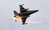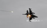 Pesawat jet tempur F-16V buatan AS pada latihan militer Han Kuang ke-36 di Taichung, Taiwan, Kamis (16/7). Latihan menembak langsung mensimulasikan respons terhadap serangan musuh terhadap objek vital di Taiwan. (FOTO : EPA-EFE/RITCHIE B. TONGO)