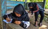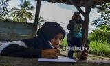 Siswa mengerjakan tugas sekolah di Desa Pasawahan, Kabupaten Ciamis, Jawa Barat, Kamis, (16/7/2020). (FOTO : Antara/Adeng Bustomi)