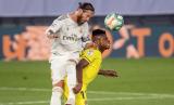 Sergio Ramos (kiri) Real Madrid beraksi melawan Villareal Samuel Chukwueze (kanan) selama pertandingan sepak bola LaLiga Spanyol antara Real Madrid dan Villarreal CF diadakan di Stadion Alfredo Di Estefano, di Madrid, Spanyol, 16 Juli 2020. (FOTO : EPA-EFE / Rodrigo Jimenez)
