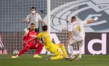 Karim Benzema (kanan) dari Real Madrid mencetak gol selama pertandingan sepak bola LaLiga Spanyol antara Real Madrid dan Villarreal CF yang diadakan di Stadion Alfredo Di Estefano, di Madrid, Spanyol, 16 Juli 2020. (FOTO : EPA-EFE / Rodrigo Jimenez)