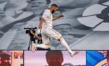 Karim Benzema dari Real Madrid merayakan setelah mencetak gol selama pertandingan sepak bola LaLiga Spanyol antara Real Madrid dan Villarreal CF yang diadakan di Stadion Alfredo Di Estefano, di Madrid, Spanyol, 16 Juli 2020. (FOTO : EPA-EFE / Rodrigo Jimenez)