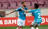 Selebrasi Roberto Torres (kiri)pada laga LaLiga antara FC Barcelona dan CA Osasuna di Stadion Camp Nou, Barcelona, Kamis (16/7) malam (FOTO : EFE)