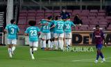 Jose Arnaiz (kiri) Osasuna merayakan dengan rekan satu timnya setelah mencetak gol pada laga LaLiga antara FC Barcelona dan CA Osasuna di Stadion Camp Nou, Barcelona, Kamis (16/7) malam. (FOTO : Alberto Estevez/EFE)