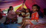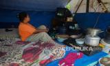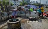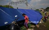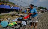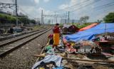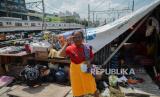 Warga Kampung Muka beraktivitas di tenda darurat yang didirikan secara mandiri setelah penggusuran pada 15 Juli 2020 lalu di Kawasan Stasiun Kampung Bandan, Jakarta, Jumat (17/7). Sebanyak 36 kepala keluarga terdampak penggusuran terpaksa membangun tenda sementara di kawasan bantaran rel hingga menunggu waktu relokasi ke rumah susun yang disediakan pemerintah setempat. (FOTO : Republika/Thoudy Badai)