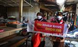 Anggota komunitas nol sampah dan sanggar hijau Indonesia melakukan sosialisasi pengurangan plastik sekali pakai di pasar tradisional Kabupaten Jombang, Jawa Timur, Sabtu (18/7/2020). Kegiatan itu untuk mengkampanyekan pengurangan penggunaan kantong plastik dalam kehidupan sehari-hari, dan diganti dengan kantong ramah lingkungan. ANTARA FOTO/Syaiful Arif/hp. (FOTO : Antara/Syaiful Arif)