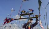 Warga memasang kincir angin atau kolecer di Desa Cisayong, Kabupaten Tasikmalaya, Jawa Barat, Sabtu (18/7/2020). Pemerintah Desa Cisayong menggunakan dana desa untuk membuat 500 buah kolecer sebagai pengusir hama burung di lahan pertanian serta memperkenalkannya sebagai permainan tradisional Sunda. (FOTO : Antara/Adeng Bustami)