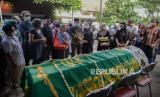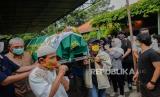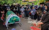 Sejumlah keluarga dan kerabat memberikan doa saat akan mengantarkan Jenazah sastrawan Sapardi Djoko Damono di rumah duka Kompleks Dosen UI Ciputat, Jakarta, Ahad (19/7). Sastrawan Indonesia Sapardi Djoko Damono meninggal pada usia 80 tahun di Rumah Sakit Eka Hospital BSD Tangerang pukul 09.17 WIB dan akan dimakamkan di Taman Pemakaman Giritama, Giri Tonjong, Bogor, Jawa Barat. (FOTO : Republika/Thoudy Badai)