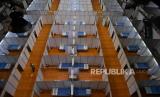 Pekerja melintas di antara bilik kamar di Sarana Olaraga Tri Dharma yang dijadikan ruang isolasi mandiri COVID-19 di Gresik, Jawa Timur, Senin (20/7/2020). Petrokimia Gresik mengubah sarana olaraga tersebut menjadi ruang isolasi mandiri COVID-19 yang terdiri dari 40 ruangan dengan kapasitas 80 tempat tidur yang telah dilengkapi sejumlah fasilitas pendukung, hal itu bertujuan sebagai bentuk antisipasi tingginya kasus mewabahnya virus Corona di Surabaya Raya. (FOTO : ANTARA/Zabur Karuru)