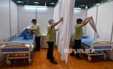 REPUBLIKA.CO.ID, GRESIK -- Pekerja merapikan tempat tidur di Sarana Olaraga Tri Dharma yang dijadikan ruang isolasi mandiri COVID-19 di Gresik, Jawa Timur, Senin (20/7).