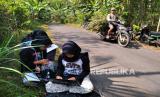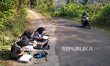 Pelajar terpaksa belajar di tepi jalan desa akibat jaringan internet yang buruk..