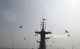 Penerbang TNI Angkatan Laut dari skuadron udara 200, Wing Udara 2, Pusat Penerbangan TNI AL, melakukan latihan tempur dengan pesawat Bonanza G-36 melintasi KRI Semarang di Perairan Teluk Jakarta, Selasa (21/7/2020). ANTARA FOTO/Muhammad Adimaja/foc. (FOTO : Antara/Muhammad Adimaja)