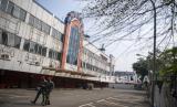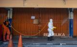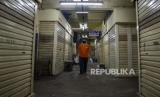 REPUBLIKA.CO.ID, JAKARTA -- Petugas keamanan berjalan di depan toko yang tutup di Pasar Asem Reges, Jakarta Barat, Selasa (21/7/2020).