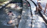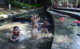 Sejumlah anak asyik mandi di anak Sungai Ciapayang, kawasan Balai Kota Bandung, Jalan Meredeka, Selasa (21/7). Meski kondisi air sungai keruh, namun tidak menyurutkan anak-anak untuk menikmati suasana. Kondisi tersebut tidak lepas dari semakin menyempitnya ruang publik di Kota Bandung, khusunya untuk bermain anak-anak yang murah dan leluasa. (FOTO : Edi Yusuf/Republika)