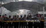 Sejumlah anggota kepolisian bersiaga saat aksi di depan Balaikota Jakarta, Selasa (21/7). Dalam aksi ini mereka menuntut agar Gubernur DKI Jakarta Anies Baswedan menghentikan proyek reklamasi di kawasan Ancol. Republika/Putra M. Akbar (FOTO : Republika/Putra M. Akbar)