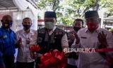 Wali Kota Bandung Oded M Danial (tengah) bersama Ketua Palang Merah Indonesia (PMI) Kota Bandung Ade Koesjanto (kedua kiri) menggunting pita saat peresmian Posko Covid-19 di PMI Kota Bandung, Jalan Aceh, Kota Bandung, Rabu (22/7). Posko tersebut bertujuan untuk mengawasi aktivitas masyarakat sekaligus memberikan edukasi, bantuan dan sosialisasi pencegahan Covid-19 di masa Adaptasi Kebiasaan Baru (AKB). Foto: Abdan Syakura/Republika (FOTO : ABDAN SYAKURA/REPUBLIKA)