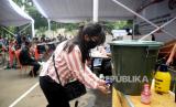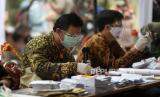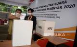 Peserta mengikuti simulasi pemungutan suara dalam pemilihan serentak 2020 dengan protokol kesehatan pencegahan dan pengendalian Covid-19 di Kantor KPU, Jakarta, Rabu (22/7). KPU memastikan protokol kesehatan diterapkan ketat saat pemungutan suara pemilihan kepala daerah serentak pada 9 Desember 2020. KPU menggelar simulasi pemungutan suara yang bakal jadi protokol resmi pada hari H pesta demokrasi.Prayogi/Republika. (FOTO : Republika/Prayogi)