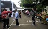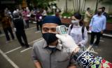 Peserta diukur suhu tubuhnya ketika mengikuti simulasi pemungutan suara dalam pemilihan serentak 2020 dengan protokol kesehatan pencegahan dan pengendalian Covid-19 di Kantor KPU, Jakarta, Rabu (22/7). KPU memastikan protokol kesehatan diterapkan ketat saat pemungutan suara pemilihan kepala daerah serentak pada 9 Desember 2020. KPU menggelar simulasi pemungutan suara yang bakal jadi protokol resmi pada hari H pesta demokrasi.Prayogi/Republika. (FOTO : Republika/Prayogi)
