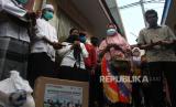 Warga membagikan minuman kacang hijau pada pasien COVID-19 yang dinyatakan sembuh, Sukati (kiri) dan Hartoyo (kanan) di Kiduldalem, Malang, Jawa Timur, Rabu (22/7/2020). Warga setempat juga menyambut pasien COVID-19 yang dinyatakan sembuh dengan maukhid atau hadrah untuk memberi semangat sekaligus mengingatkan warga lainnya agar terus waspada terhadap penyebaran COVID-19. ANTARA FOTO/Ari Bowo Sucipto/pras. (FOTO : Antara/Ari Bowo Sucipto)