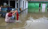 Warga mencuci pakaian di depan rumahnya yang terendam banjir di Desa Sampara, Konawe, Sulawesi Tenggara, Rabu (22/7/2020). Jumlah daerah terendam banjir akibat luapan Sungai Konaweha dan Sungai Lahambuti bertambah menjadi 64 desa tersebar di 18 kecamatan dengan total pengungsi 3.945 jiwa. ANTARA FOTO/Jojon/pras. (FOTO : Antara/Jojon)