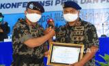 Menteri Kelautan dan Perikanan Edhy Prabowo (kiri) menyerahkan penghargaan kepada Nahkoda KP Hiu 11 Capt Slamet (kanan) yang berhasil menangkap Kapal Ikan Asing (KIA) ilegal di Stasiun Pengawasan Sumber Daya Kelautan dan Perikanan (PSDKP) Pontianak di Sungai Rengas, Kabupaten Kubu Raya, Kalimantan Barat, Rabu (22/7/2020). Edhy Prabowo menyatakan kapal pengawas Kementerian Kelautan dan Perikanan yaitu KP Orca 3 dan KP Hiu 11 berhasil menangkap dua KIA ilegal berbendera Vietnam beserta 18 nelayan Vietnam dan empat nelayan Kamboja di Laut Natuna Utara pada Rabu (15/7/2020). (FOTO : Antara/Jessica Helena Wuysang)