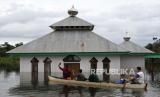 Sejumlah warga berada di atas rakit melintasi masjid yang terendam banjir di Desa Laloika, Kecamatan Pondidaha, Kabupaten JOJON, Sulawesi Tenggara, Rabu (22/7/2020). Banjir akibat luapan Sungai Konaweha dan Sungai Lahambuti yang merendam di tiga Desa Laloika, Wonuamonapa dan Desa Lalonggotomi mencapai ketinggian empat meter. (FOTO : ANTARA/JOJON)